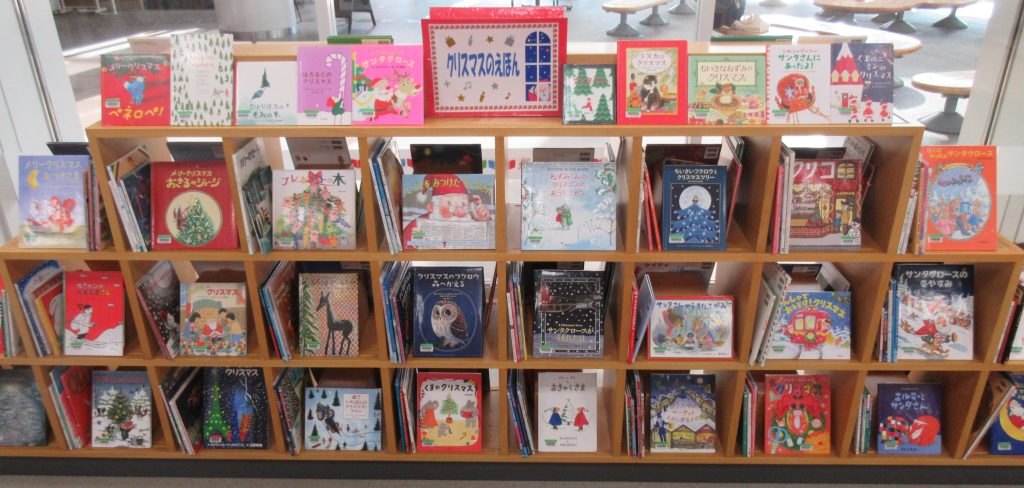 子ども展示は、「クリスマスのえほん」を12月25日まで展示します。26日からは、「干支のえほん」を展示します。