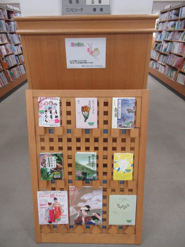 ミニ展示は、「春の訪れ」。暖かくなってきた3月に、「春」をテーマにさまざまな本を集めて展示しています。