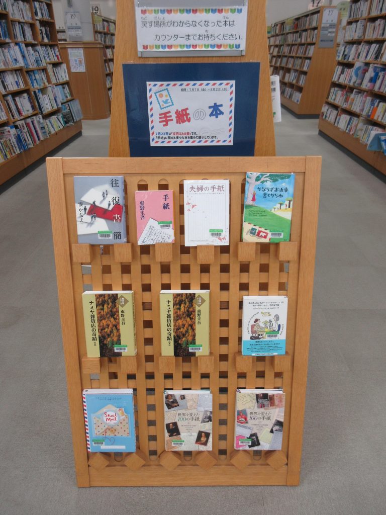 ミニ展示は「手紙の本」。7月23日の「文月ふみの日」にちなんで、「手紙」に関する本を集めています。
