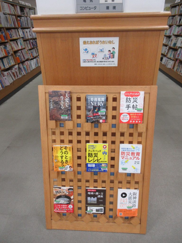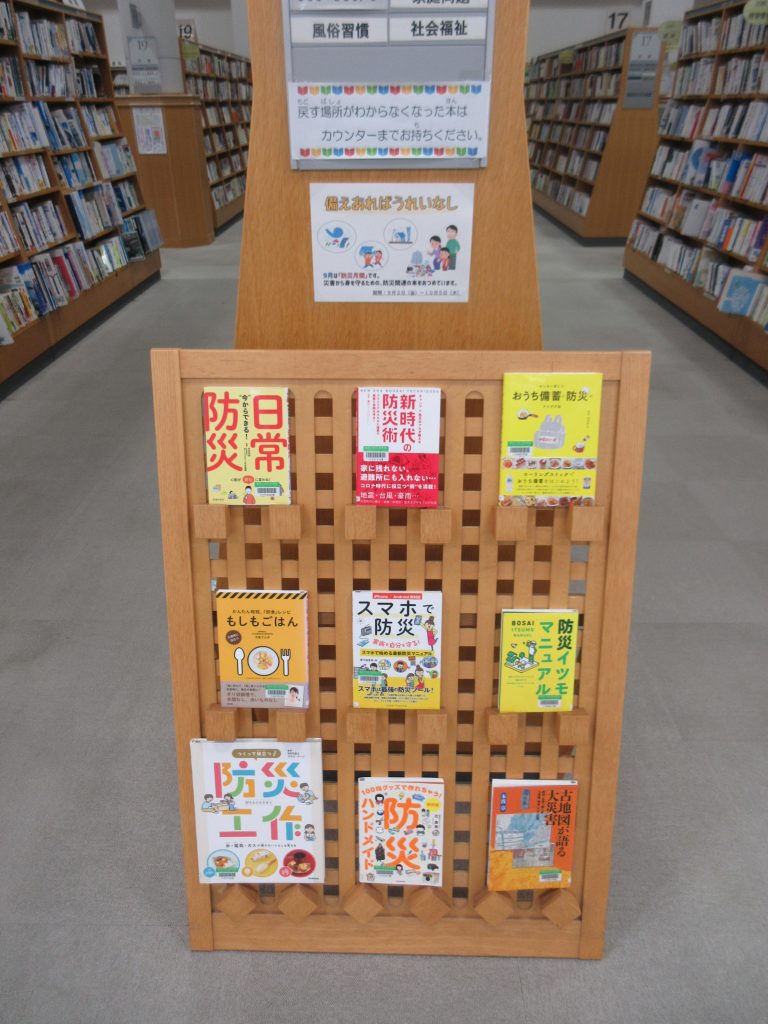 ミニ展示は「備えあればうれいなし」。9月は「防災月間」です。災害に備えるための防災関連の本を展示しています。