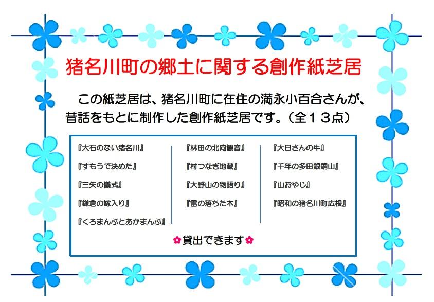 町内在住の満永小百合さんから、猪名川の昔話や歴史などをもとに製作した創作紙芝居13点を寄贈いただきました。